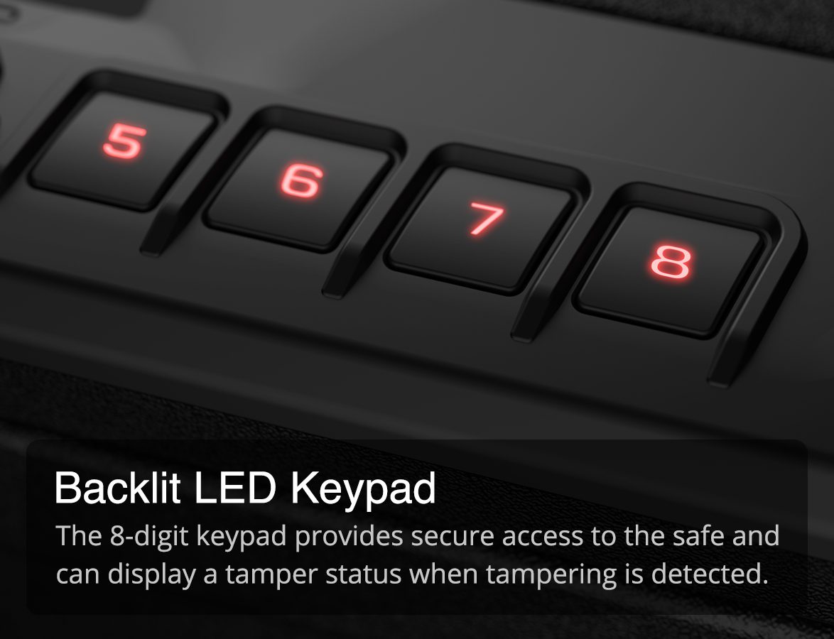 Securely access the safe using the 8-digit backlit keypad (the master code can be 4-8 digits in length), or the backup keys.