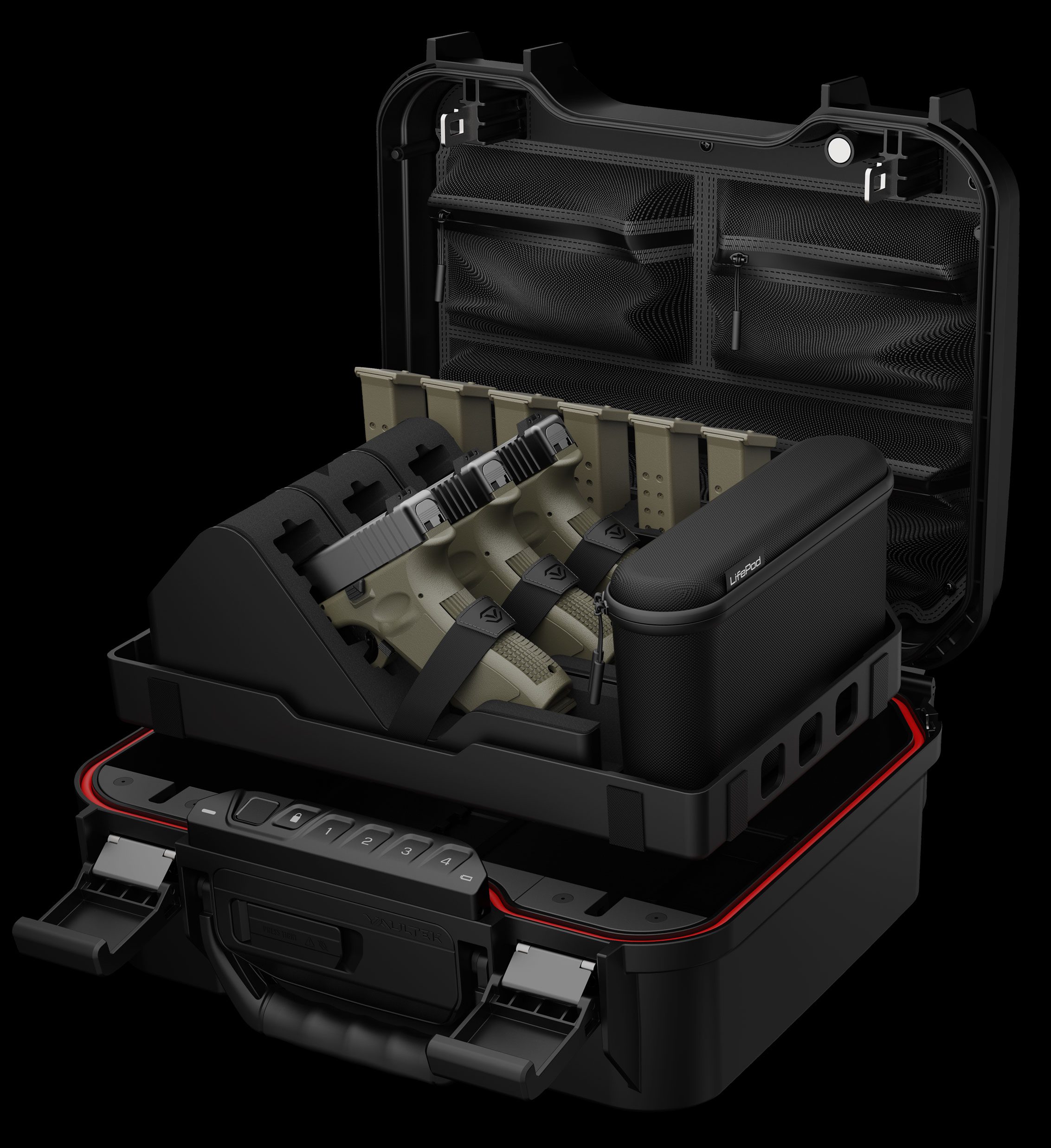 LifePod XR’s Range Edition is the ultimate kit to transport multiple pistols and magazines. Allows for extra storage capacity by utilizing the included mesh lid organizer and zip pouch.