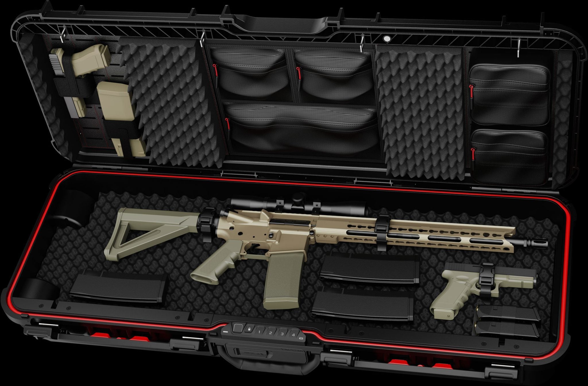 The ultimate tactical case. Built to secure up to two rifles, pistols, ammo, other critical gear, and more.