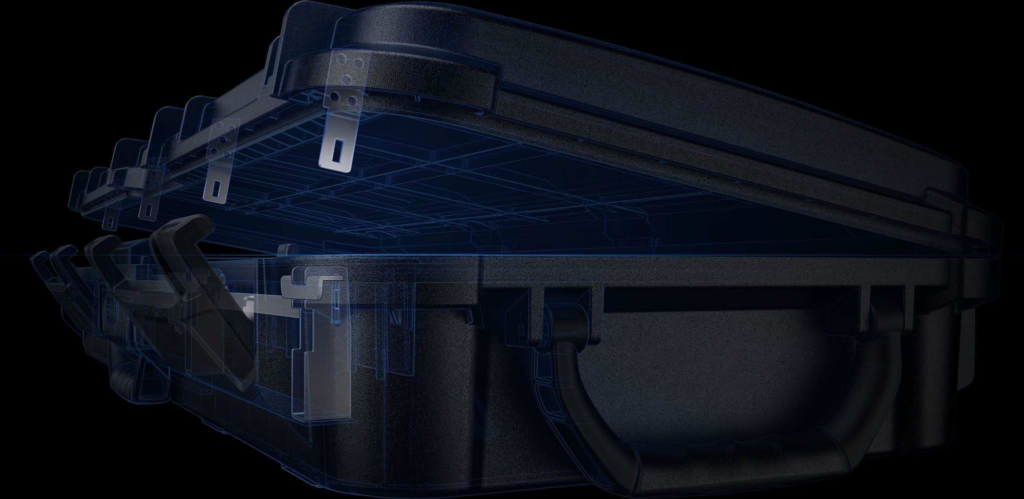 - Rugged Construction with proprietary polymer housings engineered for strength and drop tested anti-impact latches for the ultimate rugged lockbox. Built-in transport wheels and dual carry handles make it easy to move, load, and deploy. Whether you're rolling through an airport or hauling XRC to the range. Anti-theft protection features a reinforced steel interior hinge system, 4-point anti-impact latches, dual multi-point compression latches, and a quick release steel security cable.