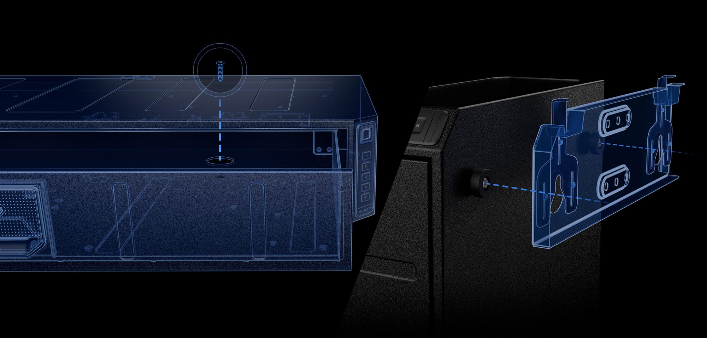 Hardmount the unit to any horizontal surface with pre-drilled holes inside the drawer, or mount vertically to the wall with the wall mount (sold separately)