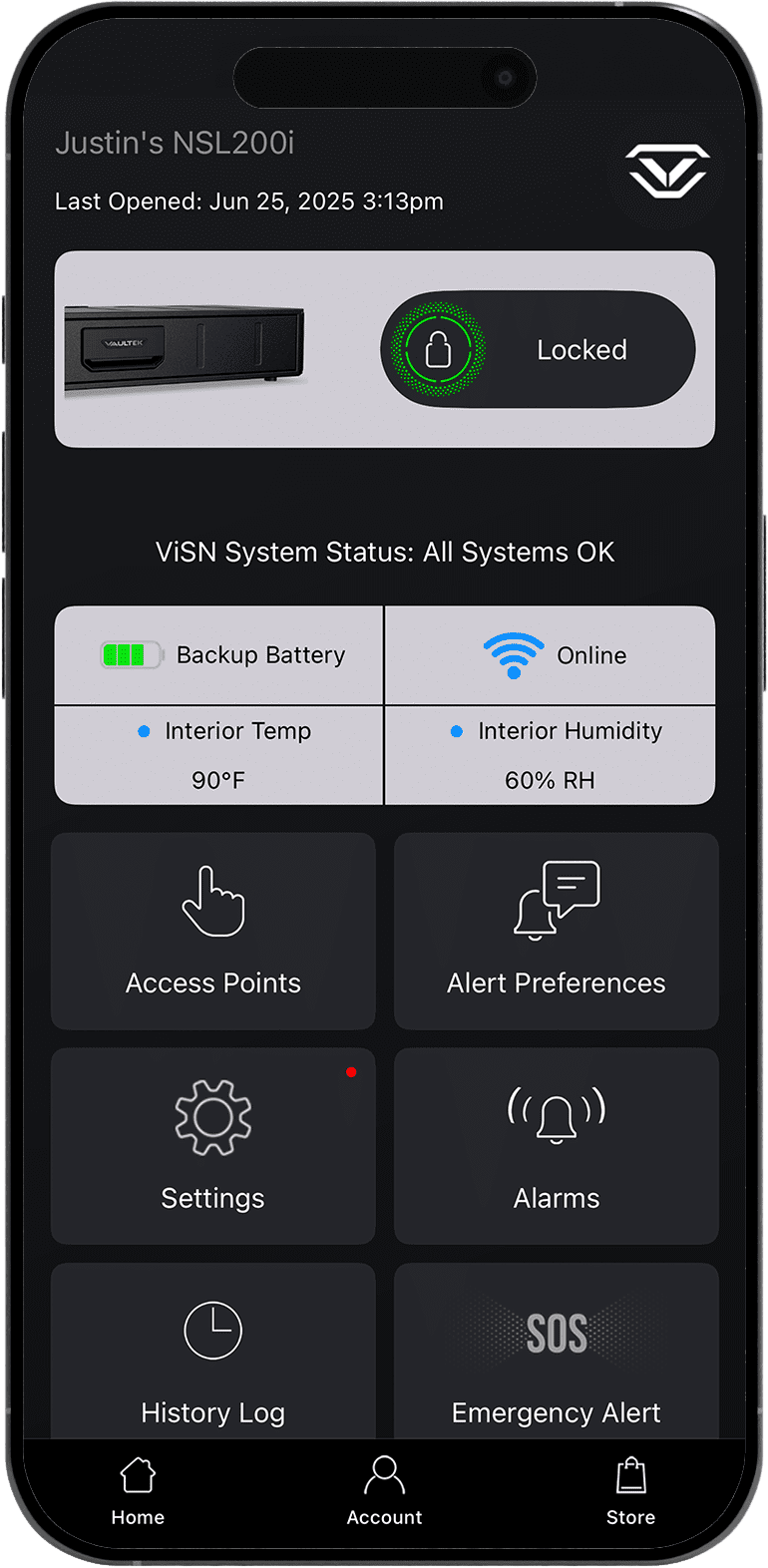 The ViSN system allows you to view your safe’s live status from anywhere. Monitor safe activity and change your preferences in real time.